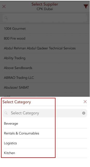 While creating an order from the app, a category filter option has been added to filter out suppliers based on the selected category.