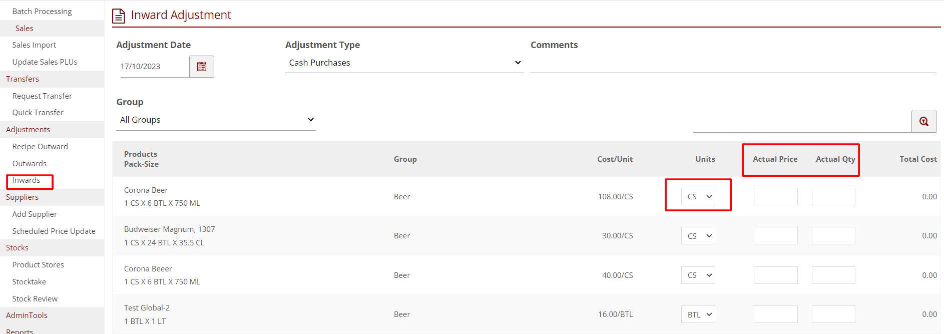 This feature can be used to record any petty cash bought items like store purchases. For recording petty cash, go to Inward Adjustment. Select the Adjustment Date, Adjustment Type, and record the adjustment against the respective product. The unit can be changed if needed, Price & Qty needs to be entered. Once done, click Finish Adjustments to save it. Since this is an adjustment, it will not have any impact on the product prices in reports even if it is on the weighted average inventory method.