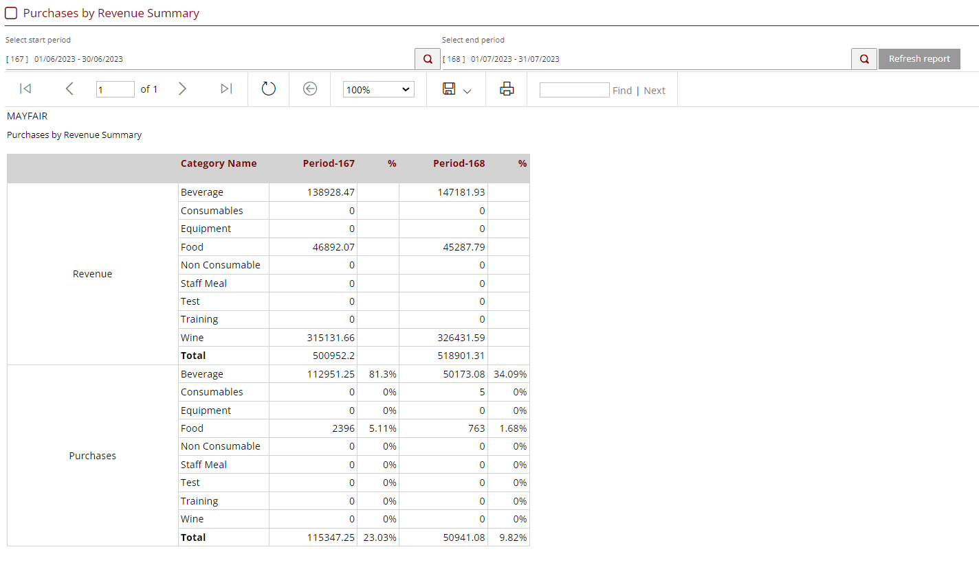 A new report has been added under Reports > Sales and GP > Purchases by Revenue Summary. This will show purchase & revenue data periodwise for all the categories for the selected periods.
