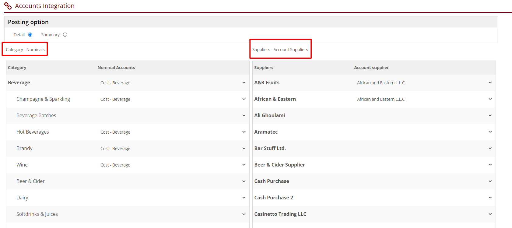 The posting option should be kept on Detail. Map all the categories & suppliers between the two software.