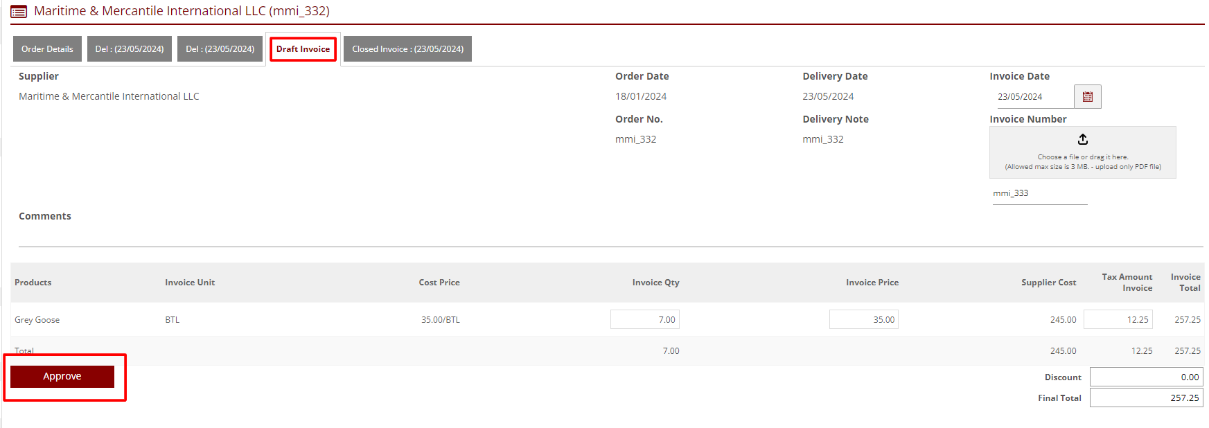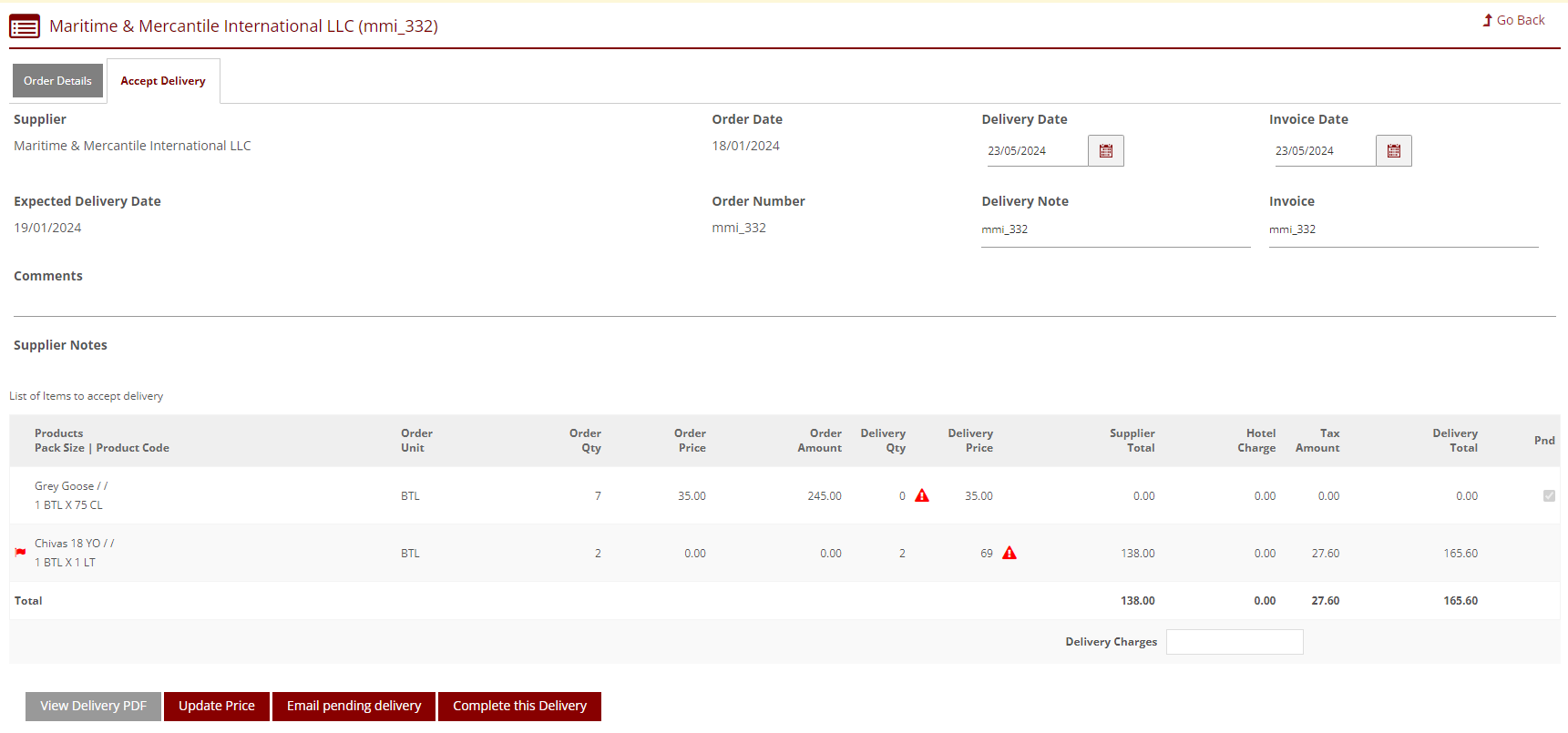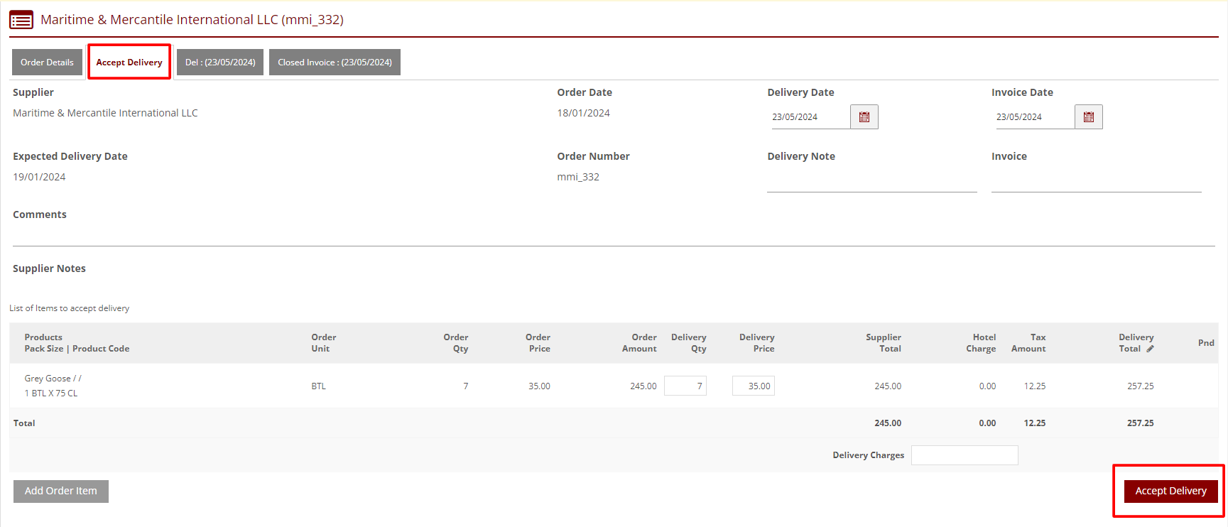 - The second half of the same delivery can be accepted when received & respective invoice can be approved from List Deliveries.