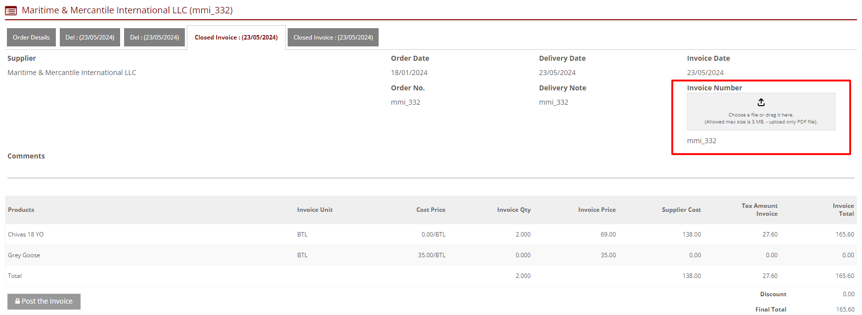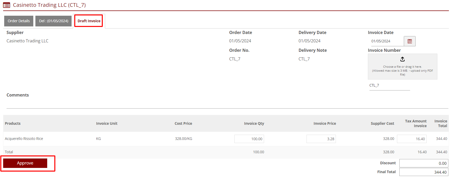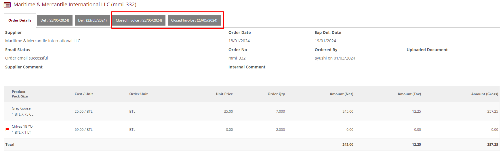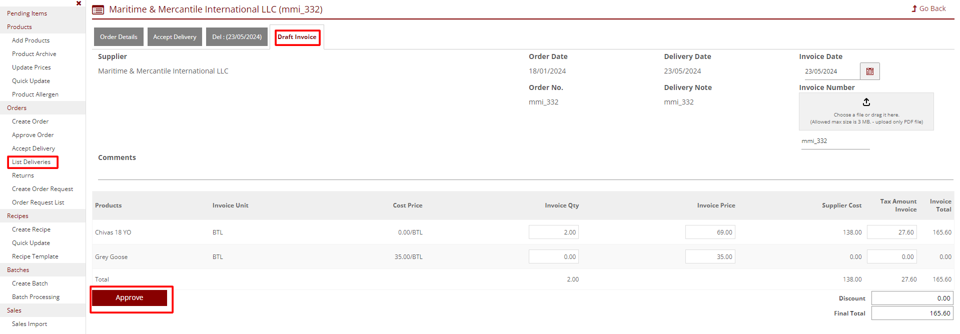 - The second half of the same delivery can be accepted when received & respective invoice can be approved from List Deliveries.