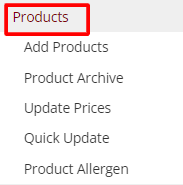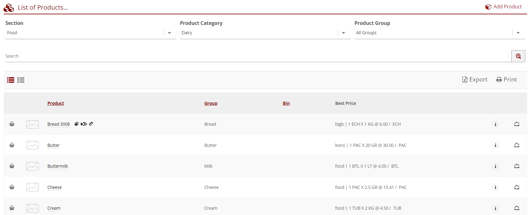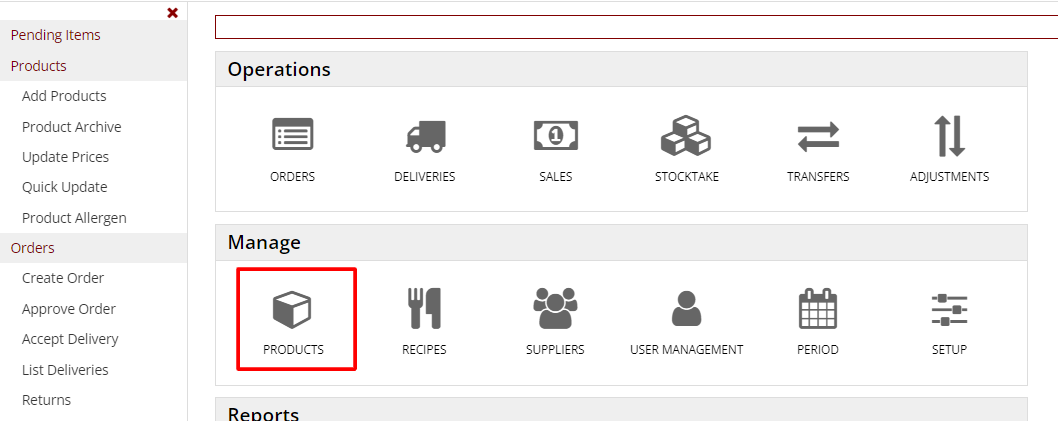 The Product List can be accessed using the Products header on the main menu or the Products Quick Access Icon on the Home Page.