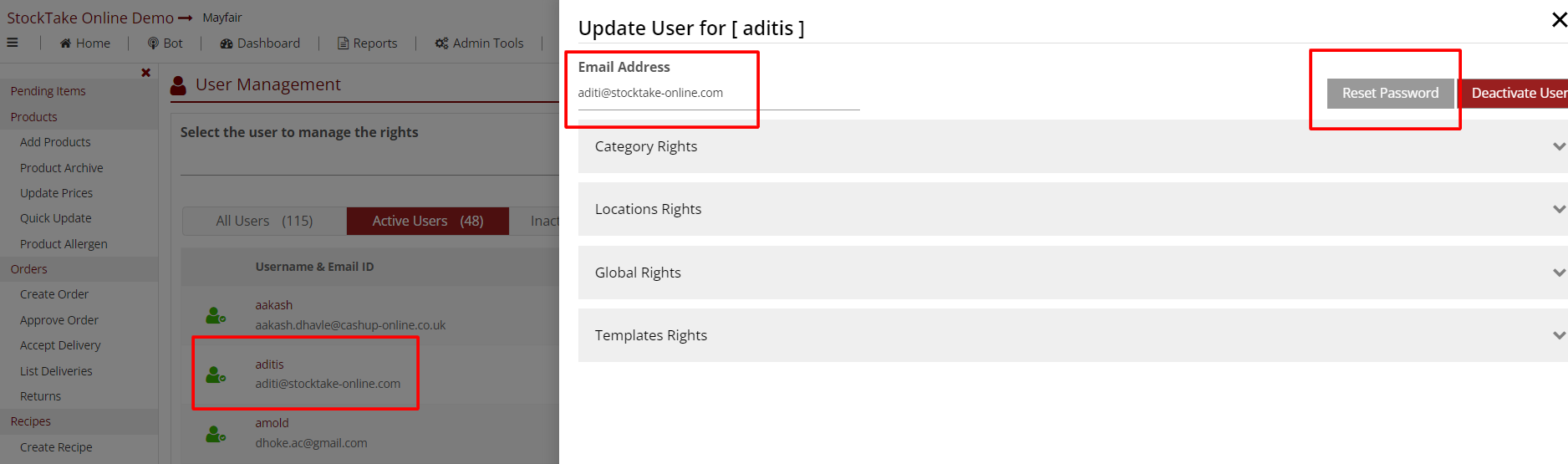 - Templates Rights displays the User Rights Template assigned to this user. It can be changed here, or a Custom Template can be assigned and individual rights allocated.