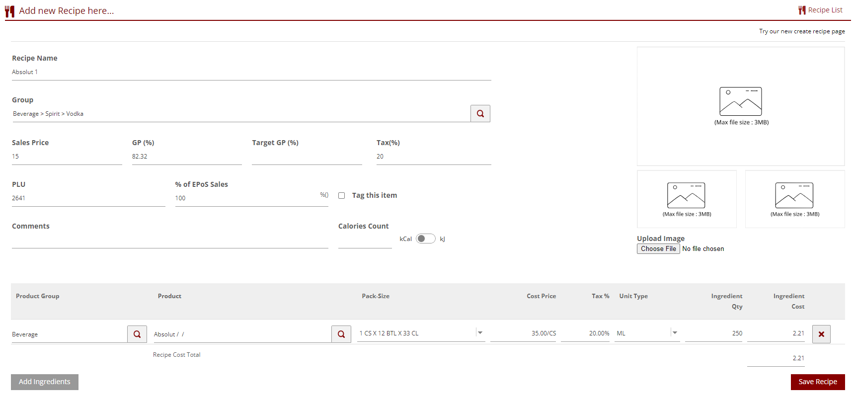 - Once all the ingredients have been added and you are happy with the information for the recipe, click on Save Recipe.