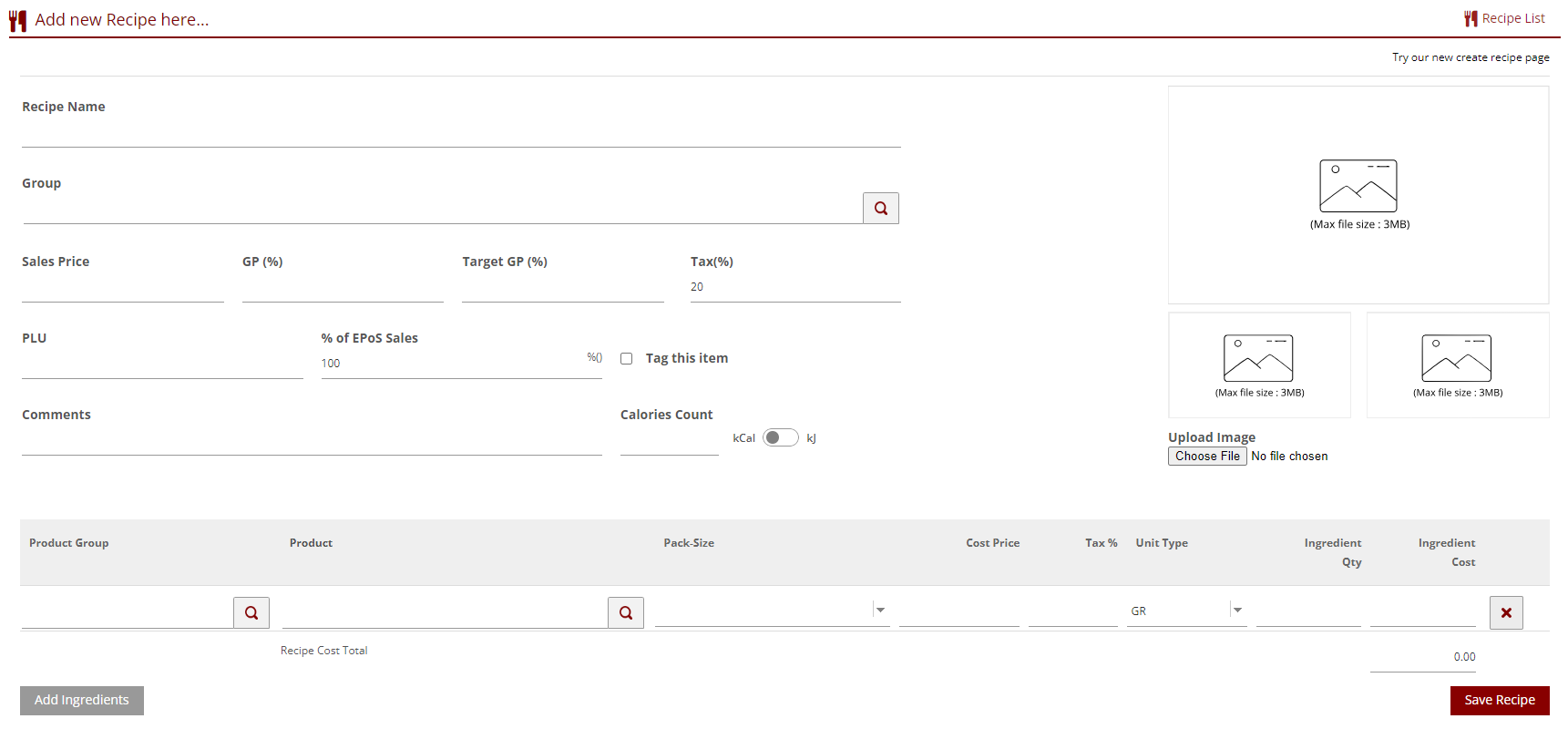 Stocktake Online offers two ways to create new recipes on the system from the Create Recipe option under Recipes. The difference lies in the process of adding the ingredients. Below are the details:-