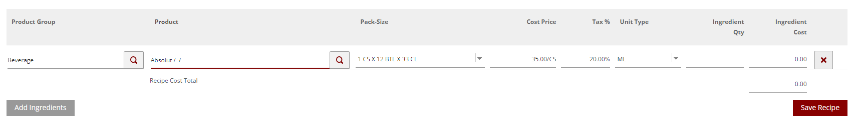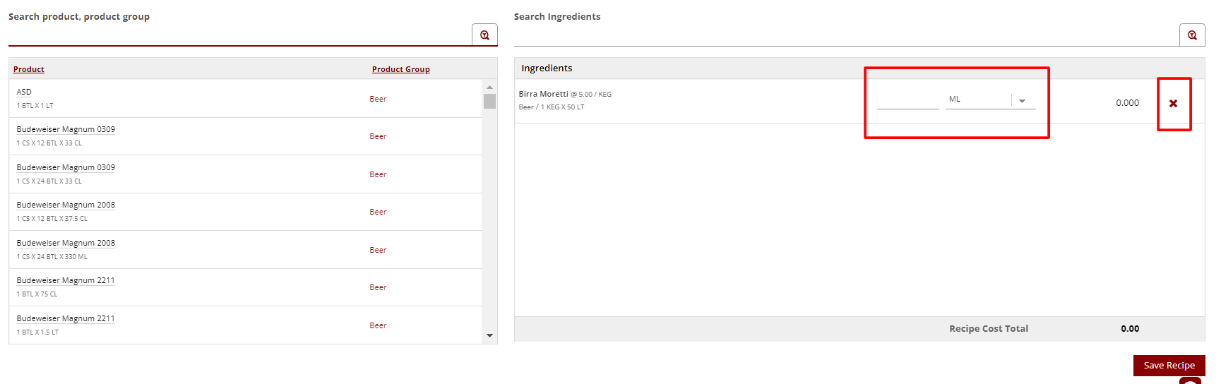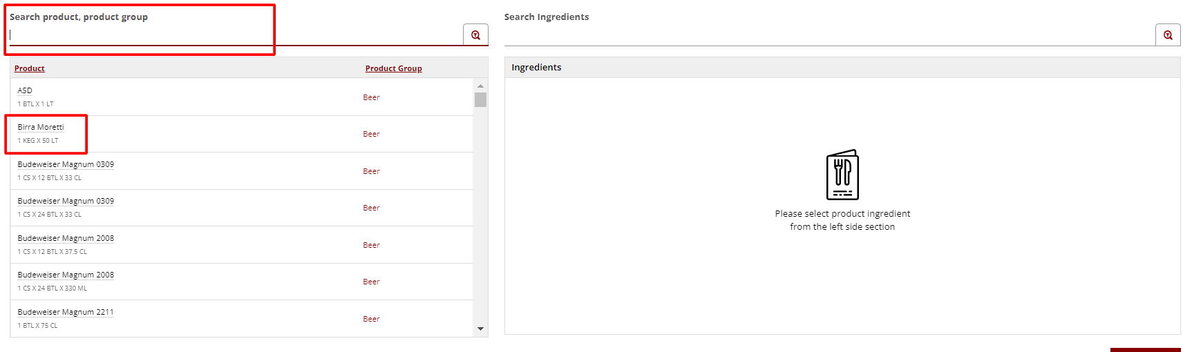 The product can be searched with its name or group & needs to be clicked to add to the recipe.