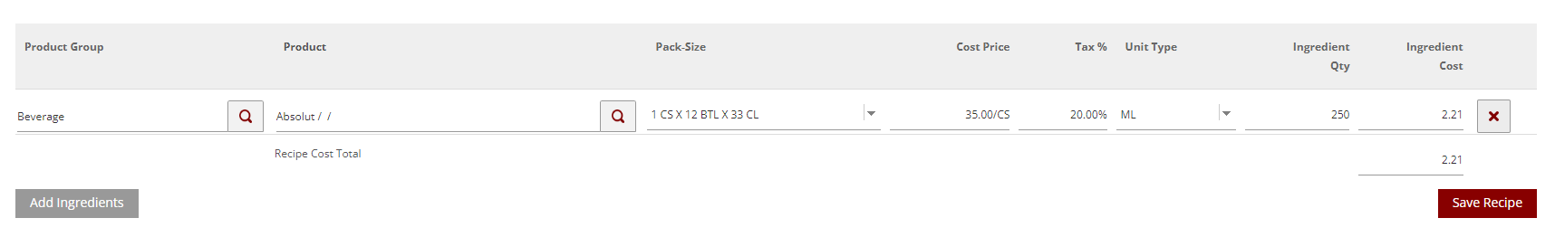 - Change the unit type as desired and type in the quantity of the ingredient you wish to use; the cost will be automatically generated.