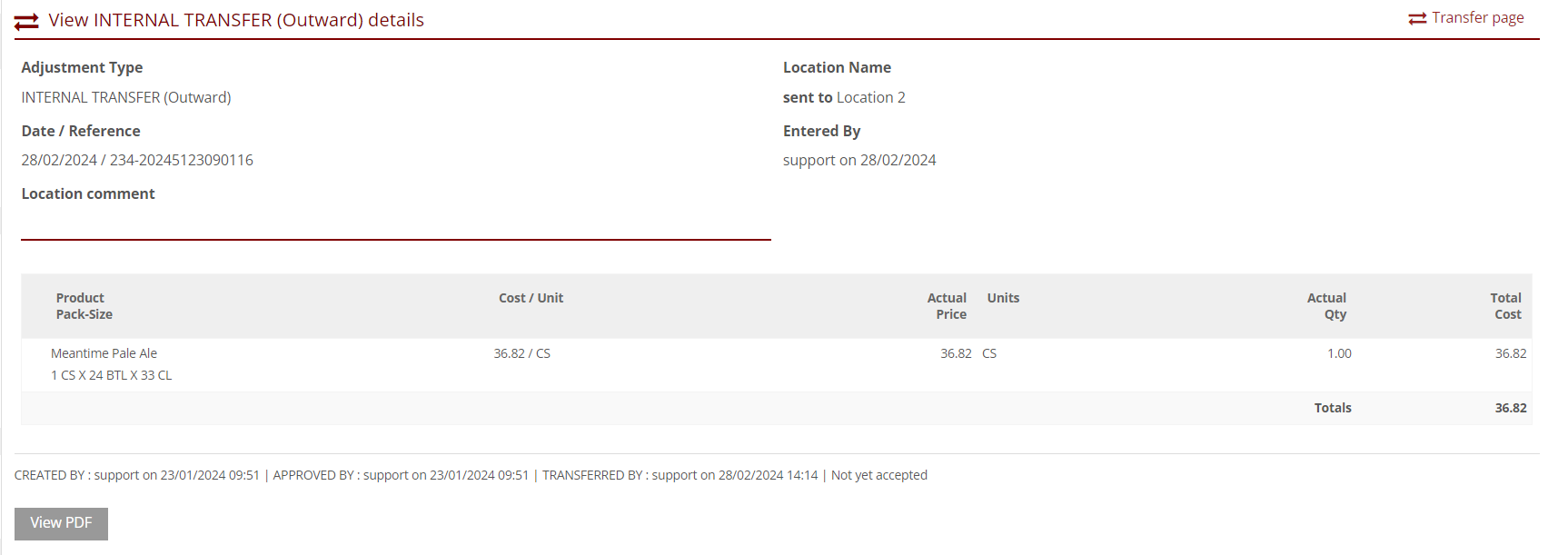 - Created by, Approved by, Transferred by, and Accepted by details will be displayed below the transfer information. If it is yet to be accepted, it will show as "Not yet accepted".