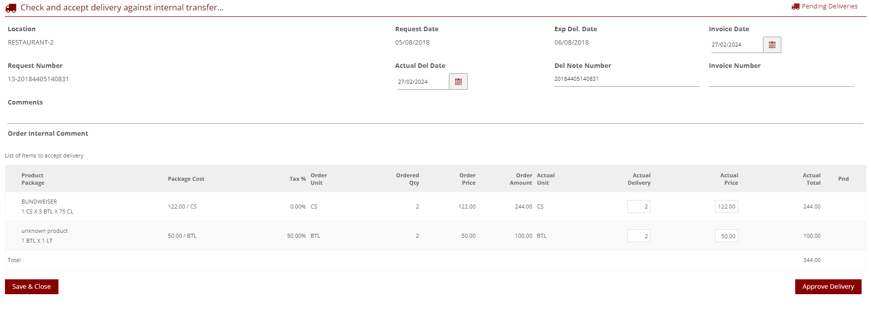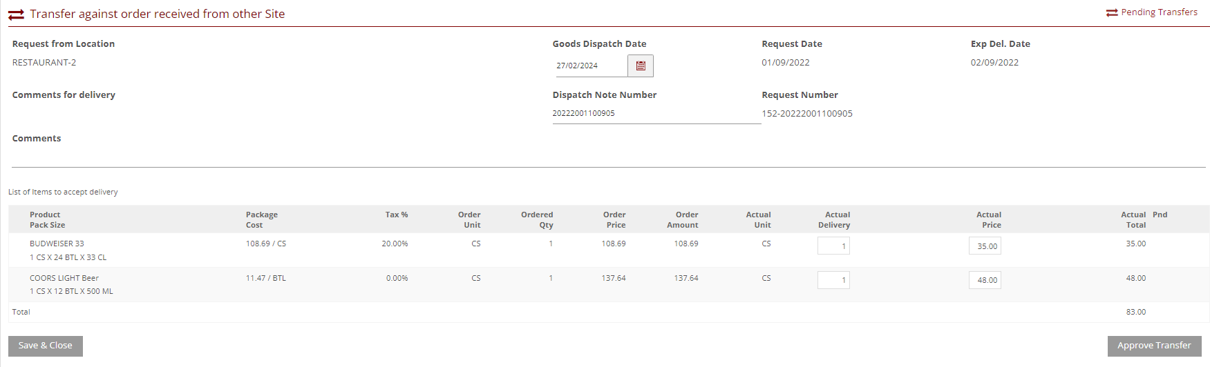 - Edit the Actual Delivery Quantity (Actual Delivery field) to accept less than was transferred - Please Note you cannot accept more than was transferred. For any additional items, we recommend raising another transfer request or entering a quick transfer or adjustment.