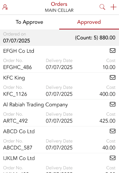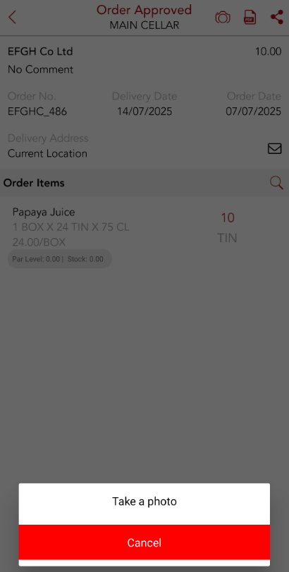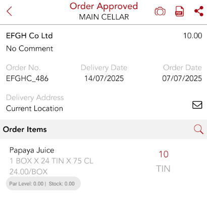 For situations where suppliers aren't accepting orders over email, users can share the PO copy after the order is approved. This can be done using the share icon in the upper-right corner of the page.