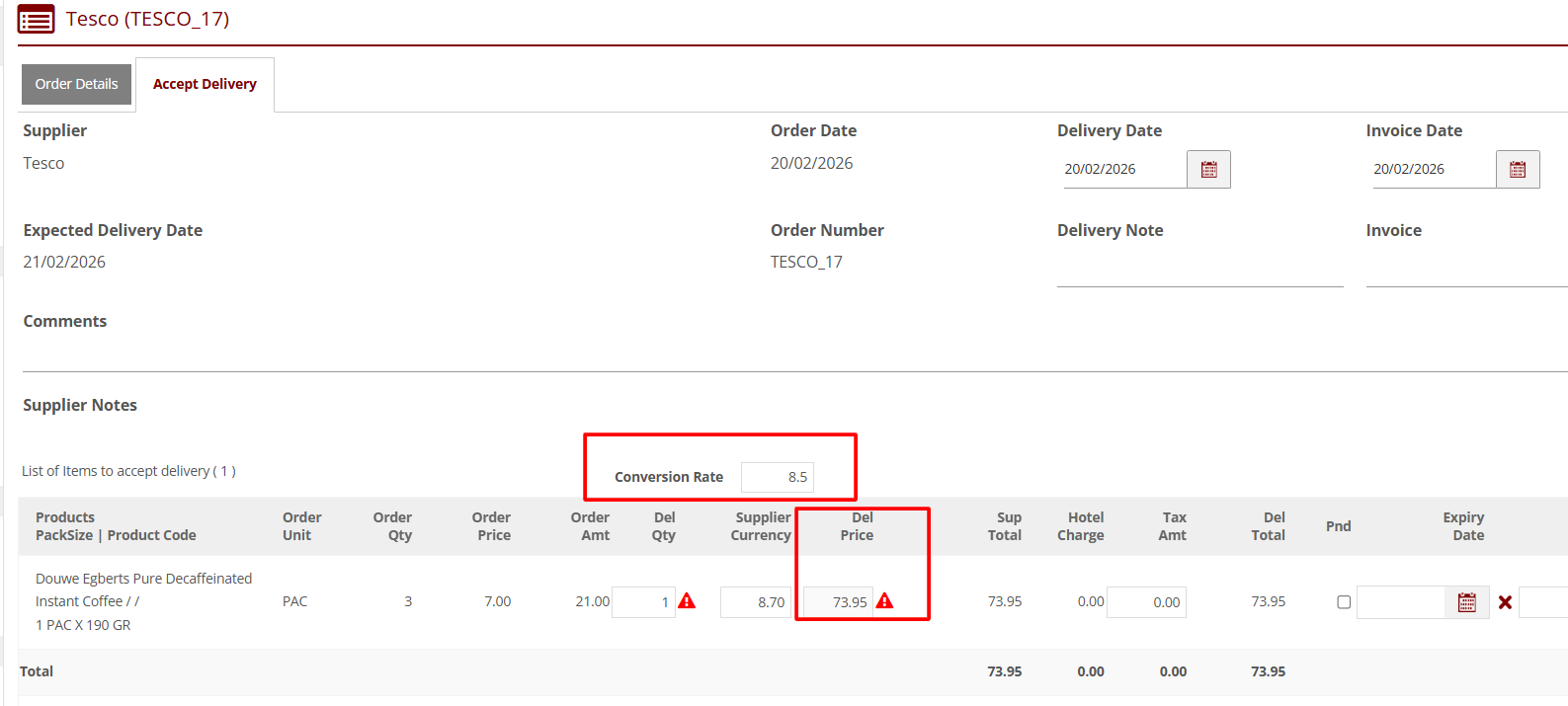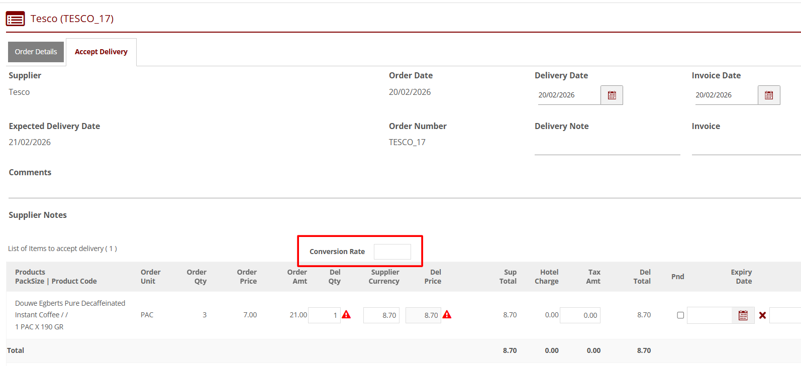 In accordance with the client's requirements, currency conversion may now be enabled for any supplier and can be applied to all outstanding deliveries. This functionality must be activated from the backend by STO Support.