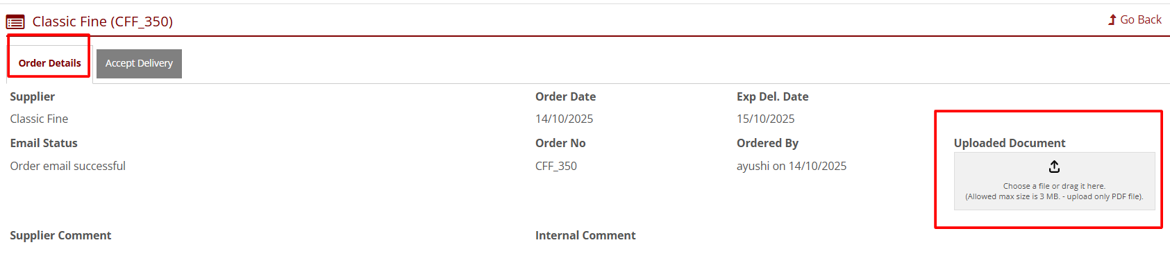 On the orders page, users can upload documents not only through the traditional file selection method but also by simply dragging and dropping their files into the designated area. This drag-and-drop functionality streamlines the process, making it quicker and more intuitive for users to attach the necessary documents to their orders.