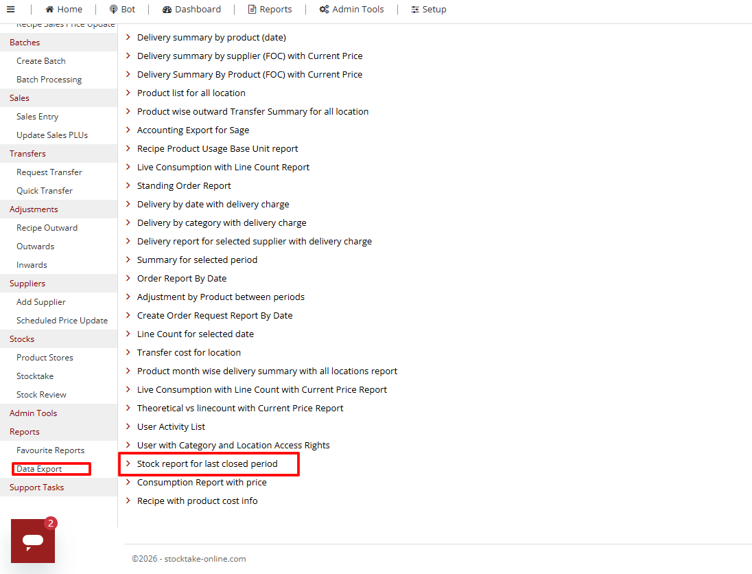 The stocktake report for the most recently closed period across all locations can be obtained via the Data Export option. This functionality must be enabled in the backend by STO Support.