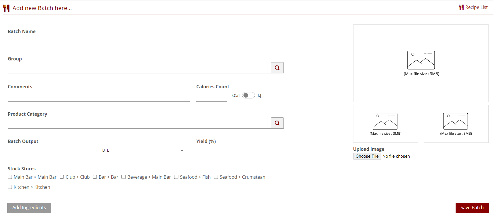 - Similar to recipes, the batch recipe creation screen requires: