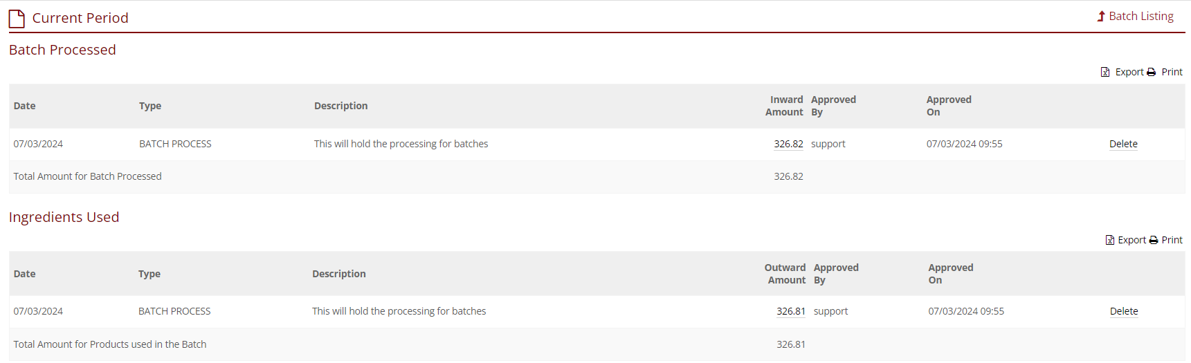 Once you have entered your quantities, click on the Save Batch button at the bottom. The system will process your batches, transferring raw ingredients into their chosen batch form. Once complete you be shown the Batch List page. Details of processed batches will be shown under "Batch Processed" while that of respective depleted ingredients will be under "Ingredients Used" which can be pulled by clicking on the amount.
