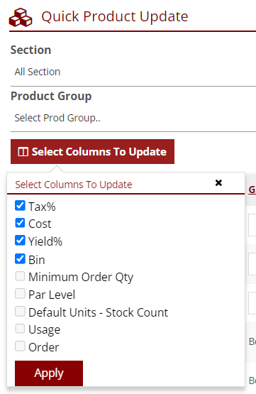 - Using the option Select Columns to Update provides the user with a further menu that can be used to customize the Quick Update fields.