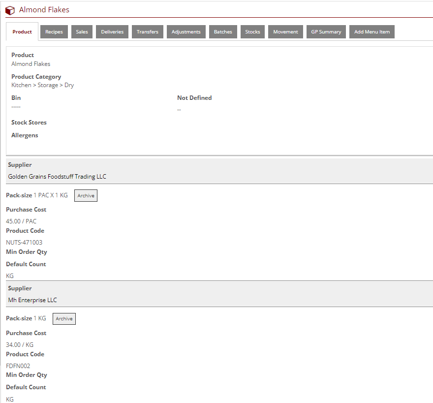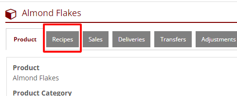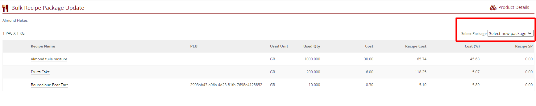 - As an example, we currently have several recipes currently using the product ALMOND FLAKES and the pack-size 1 PAC X 1 KG. If we locate our product in the product list: