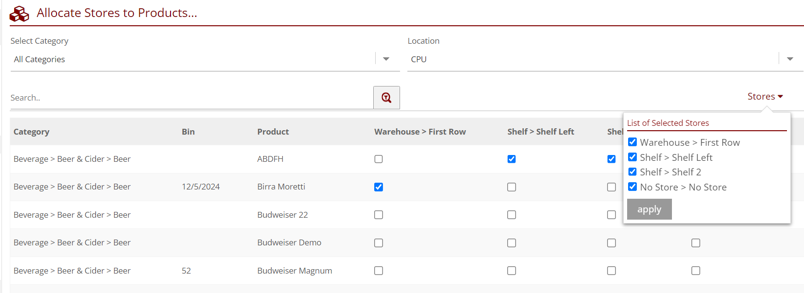 - Allocate products to stores using the tick boxes.