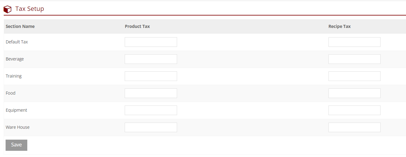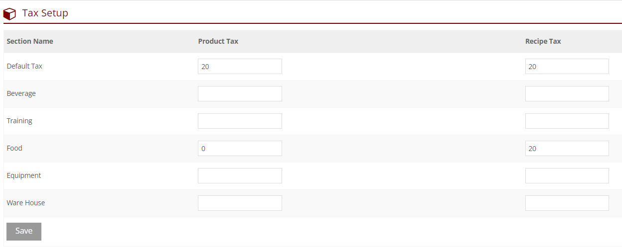 - The Default Tax will be followed by Products and Recipe unless superseded by Section-specific entries.